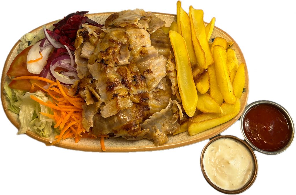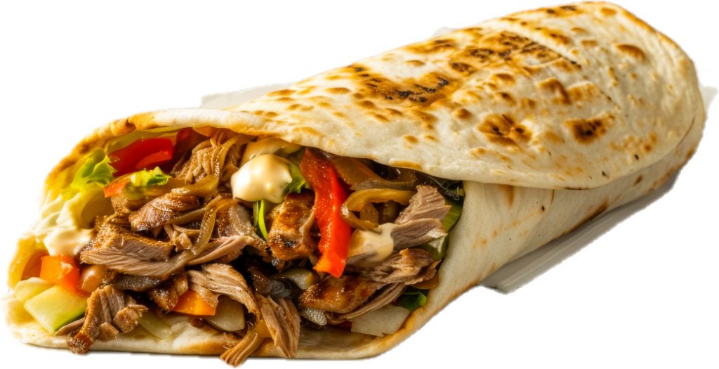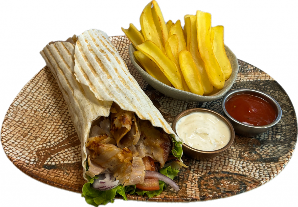 Pan mediterráneo recién hecho, carne Gyros jugosa, verduras frescas, patatas doradas y una combinación perfecta de salsas griega.