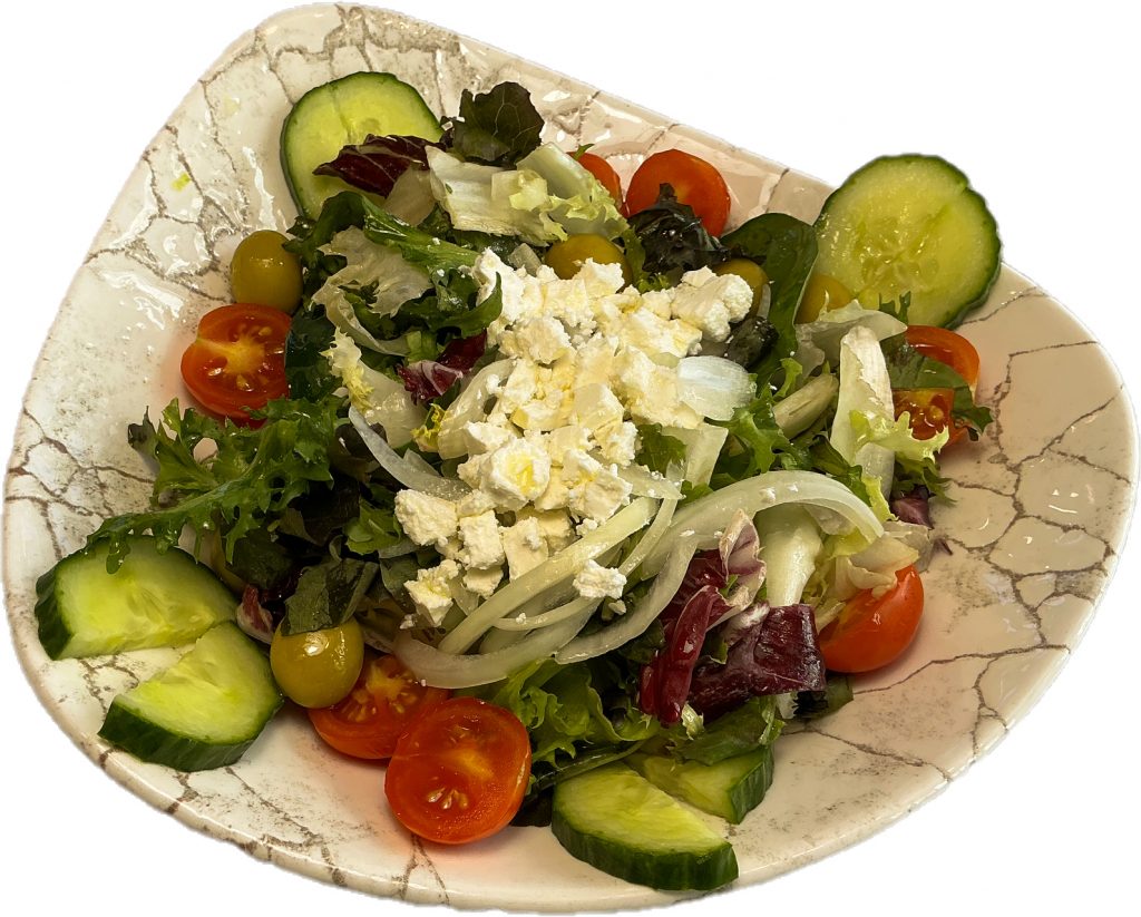 Mezcla de lechugas frescas, tomate, pepino, cebolla, aceitunas y queso feta, todo realzado con un toque de sirope de granada.