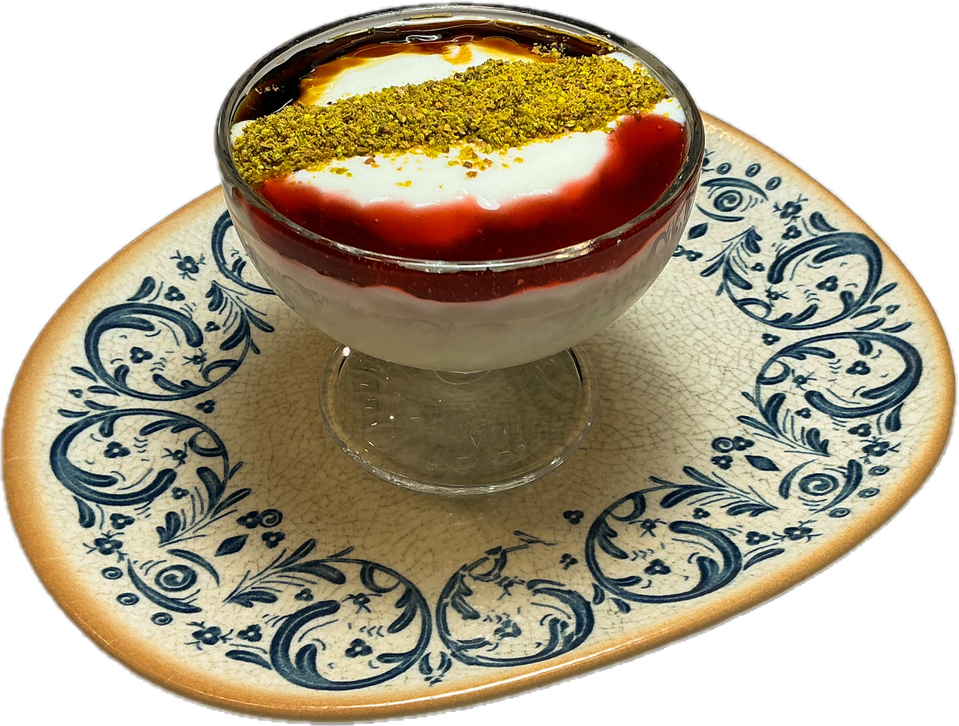 Yogourt al limón, sirope de fresa, caramelo liquido y pistacho.
