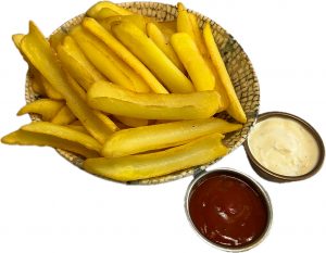 Crujientes patatas fritas servidas con salsas griega irresistibles.